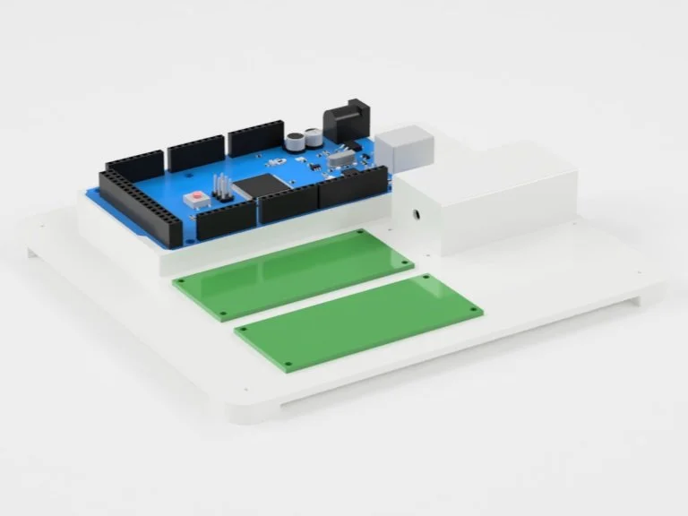 The Arduino Mega is mounted on a raised, dedicated raised mounting block to allow the user better access to all input and output connections as well as provide additional structural support to the component.