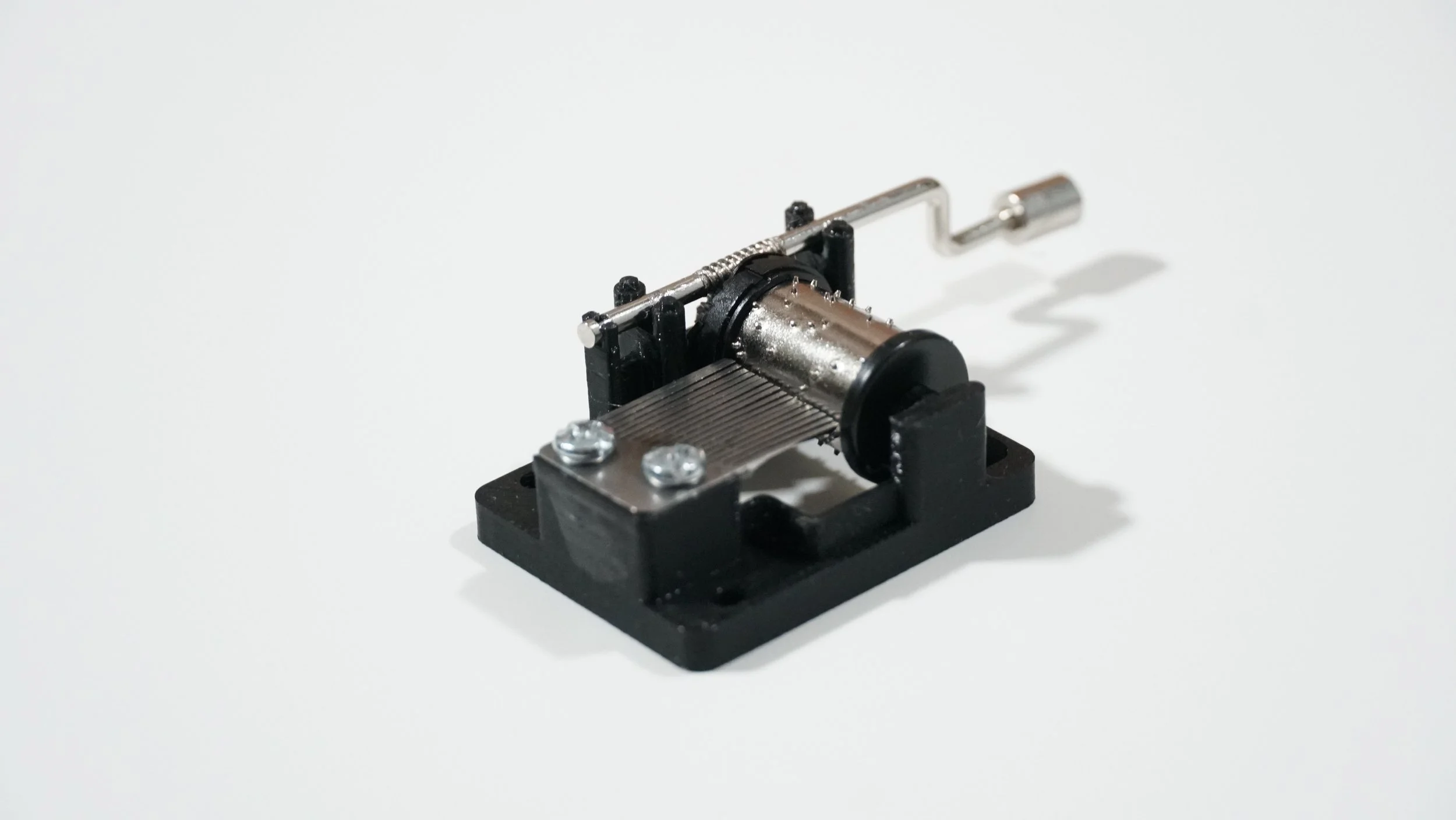 Analyze the provided original metal music box, re-create it exactly as a 3D model and print a working light-weight alternative for manufacture.