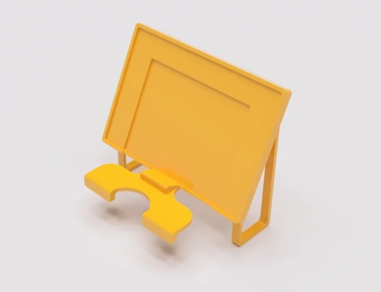 This mounting plate can then be connected to a separate hook and two legs. The legs are designed to raise the device above the 2 inch tall keyboard and tilt back the display by 25 degrees. Each piece was intentionally made separate to simplify the 3D print process and all of the parts were designed to snap together further removing the need for fasteners.